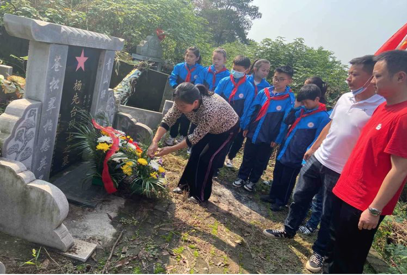西山街道人大工委主任洪少珍、街道退役军人服务站站长肖俊、七里界村干部和部分少先队员向杨先台烈士墓献花
