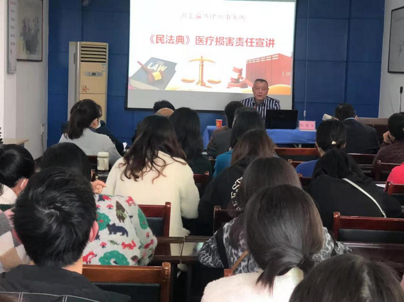 为了进一步增强医院干部职工法律法规知识水平,增强依法行医法律意识,3月29日下午,鄂州市优抚医院邀请法律顾问湖北瀛博律师事务所张爱军、郭慧律师为全院干部职工进行《<民法典>之医疗损害责任条文解析》的专题宣讲。