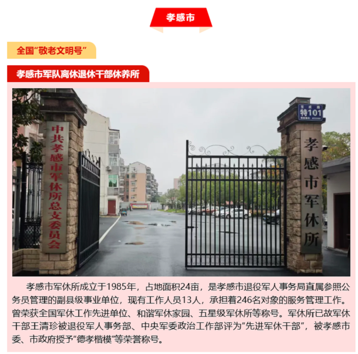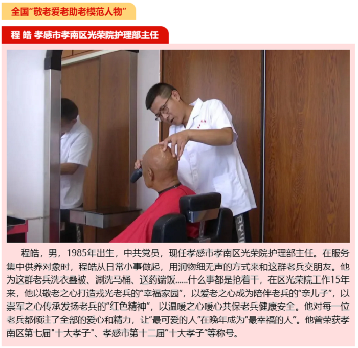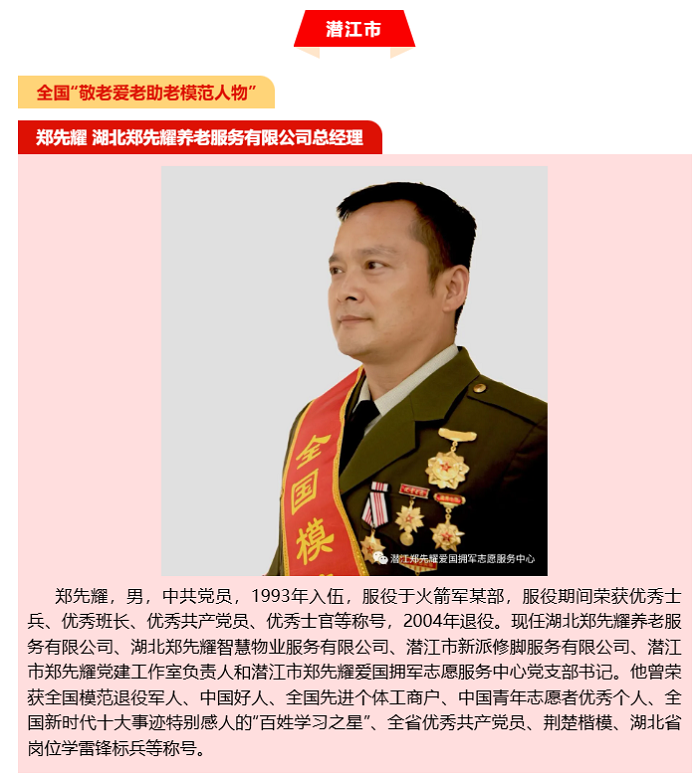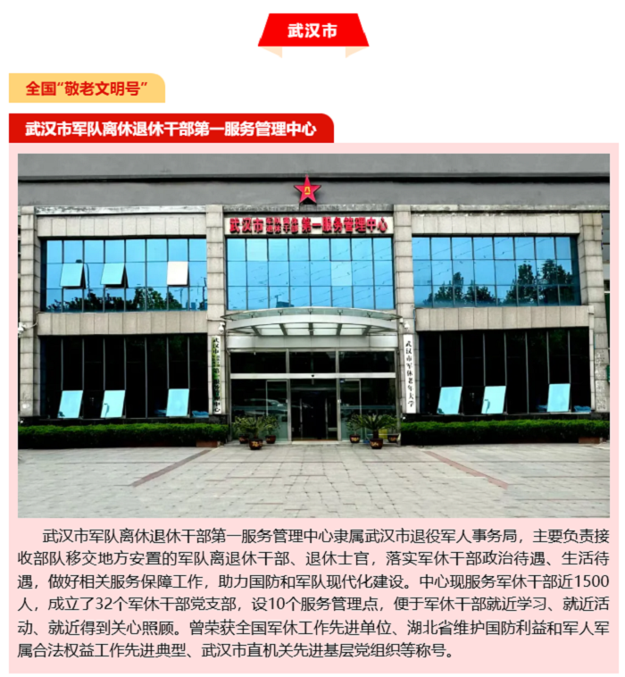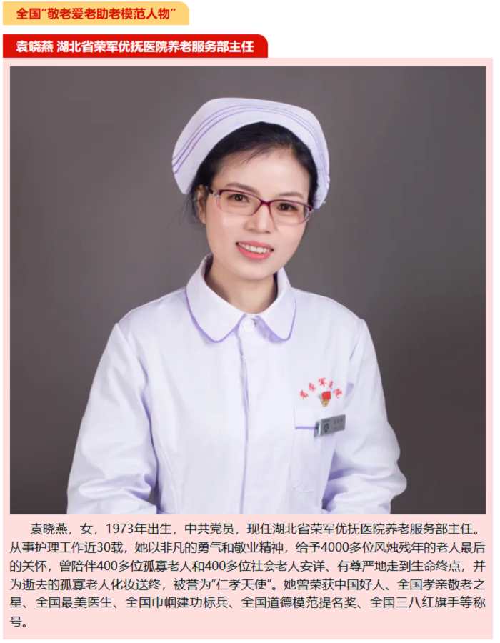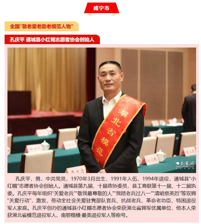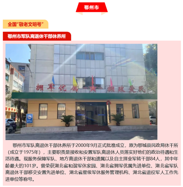 湖北省退役军人事务系统和退役军人上榜:4个集体被授予全国“敬老文明号”称号, 4名个人被授予全国“敬老爱老助老模范人物”称号。