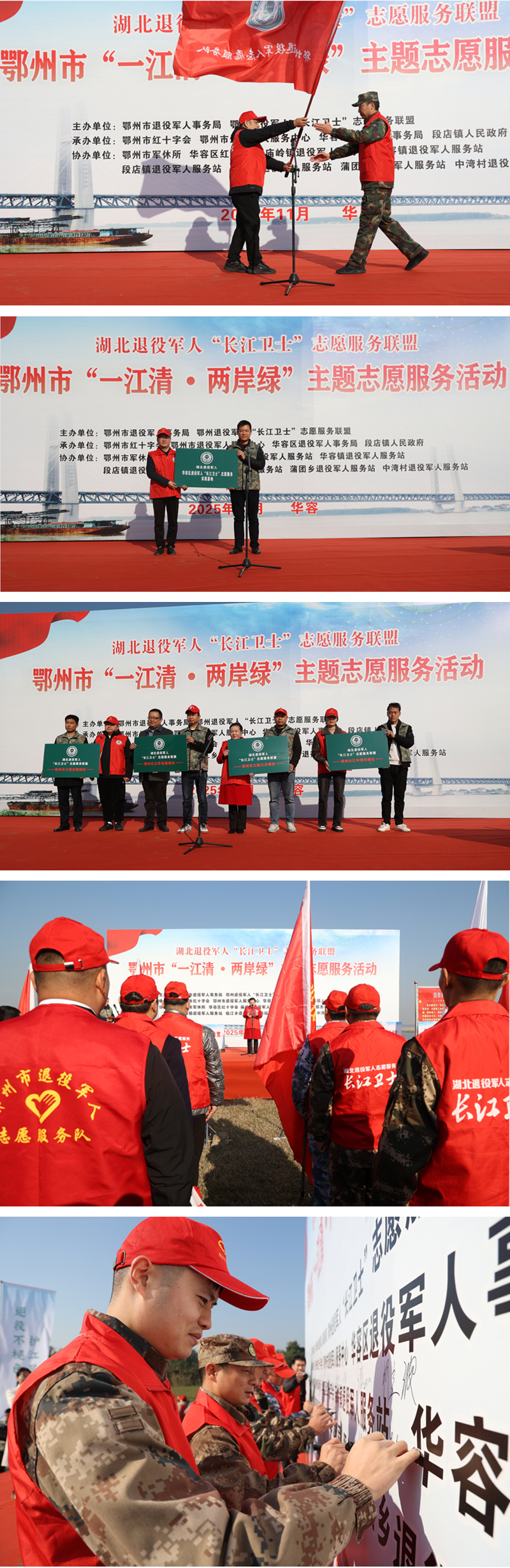 上午9时,“一江清·两岸绿”长江生态保护暨“认领一段河”志愿服务活动启动仪式在华容区段店镇中湾村江滩举行。来自市退役军人事务局、市红十字会、华容区退役军人事务局等单位的十余支志愿队、百余名退役军人整齐列队、整装待发。仪式上,为湖北省退役军人“长江卫士”志愿服务联盟鄂州市退役军人志愿服务队授旗,为华容区退役军人“长江卫士”志愿服务实践基地授牌,为华容区长江沿线设立的4个“长江哨位”授牌。华容区退役军人事务局主要负责人代表全区退役军人志愿者作表态发言和动员讲话。