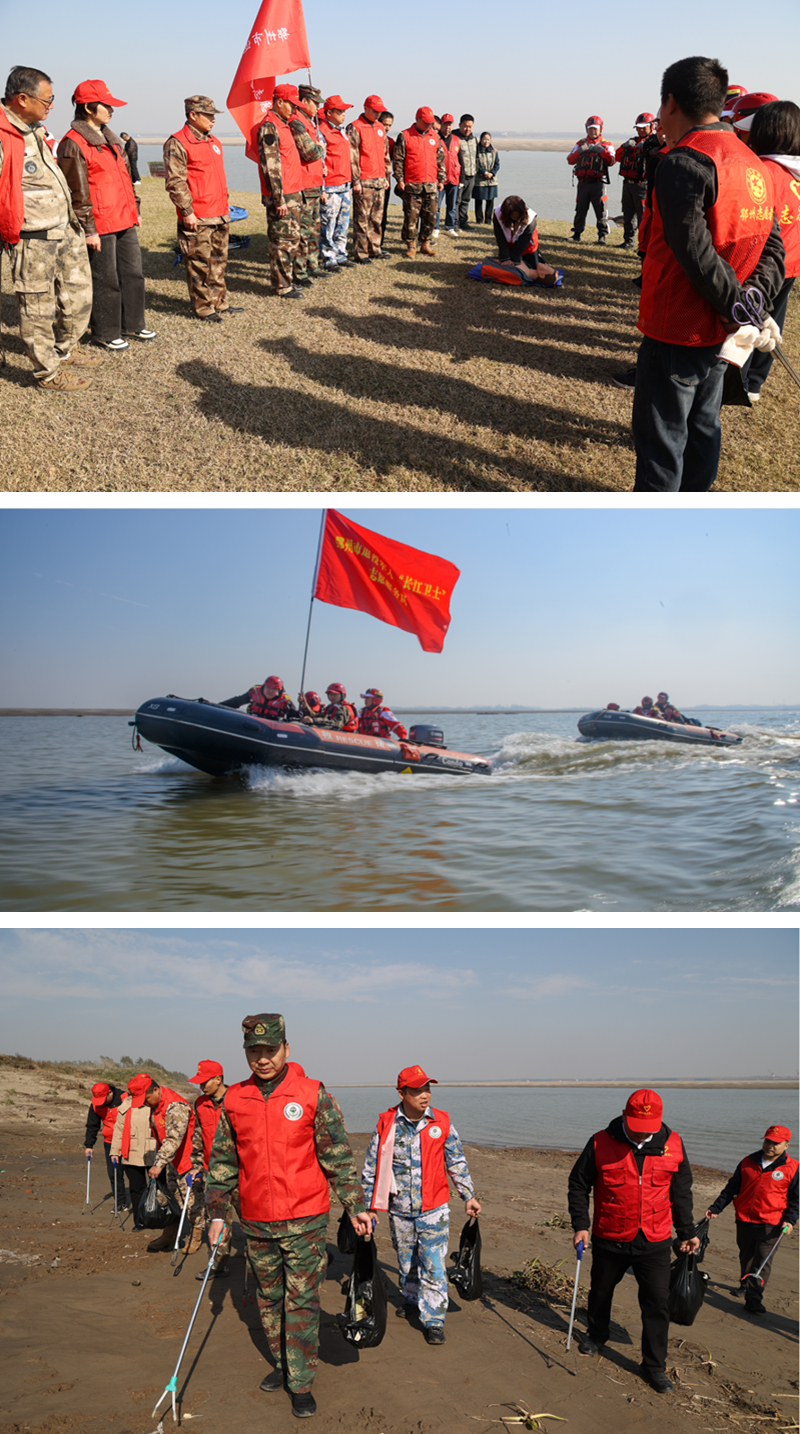 启动仪式后,志愿者们身着统一服装,迅速投入行动、分工协作。由市红十字救援队与市退役军人“长江卫士”志愿队组成的应急救援演练组,开展了一场紧张有序的水上演练。通过江面巡逻与模拟溺水急救,切实提升了应对水域突发事件的实战能力。华容区“长江卫士”志愿服务队员则化身流动宣传站,向沿江居民发放宣传手册,细致讲解长江生态保护知识,引导群众增强环保意识,自觉参与守水护水。净滩行动组的志愿者们手持工具,对江滩展开“地毯式”清理,细致排查并清除隐藏在植被中的垃圾与河道漂浮物,努力还原水清岸绿的自然生态。