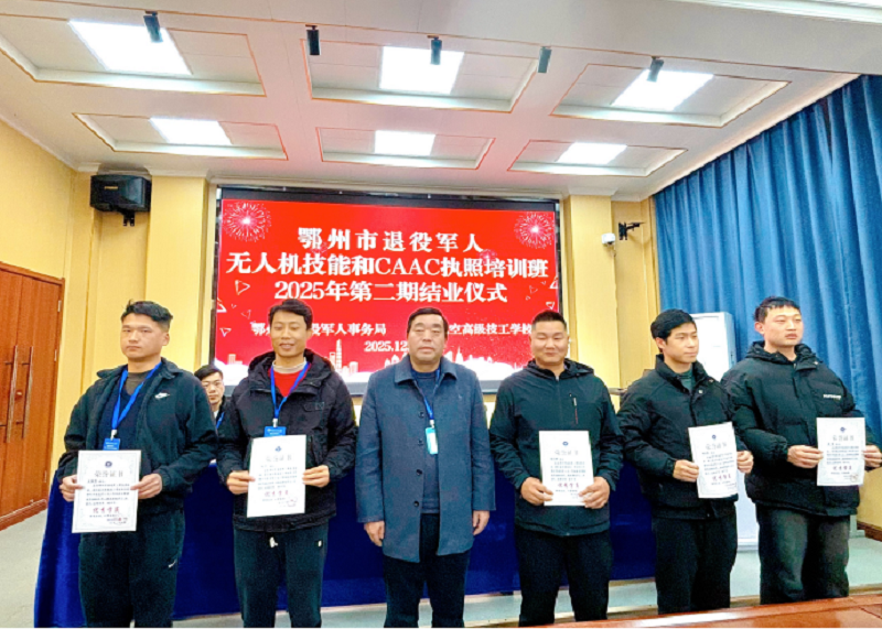 仪式上,为5名优秀学员颁发证书并合影留念。优秀学员代表胡子濠分享了在无人机理论学习与实操训练中的收获与感悟,坦言培训不仅让自己掌握了专业的无人机操控技能,更增添了就业创业的信心,同时也对鄂州市退役军人事务局和湖北航空高级技工学校提供的学习机会表达了诚挚感谢。