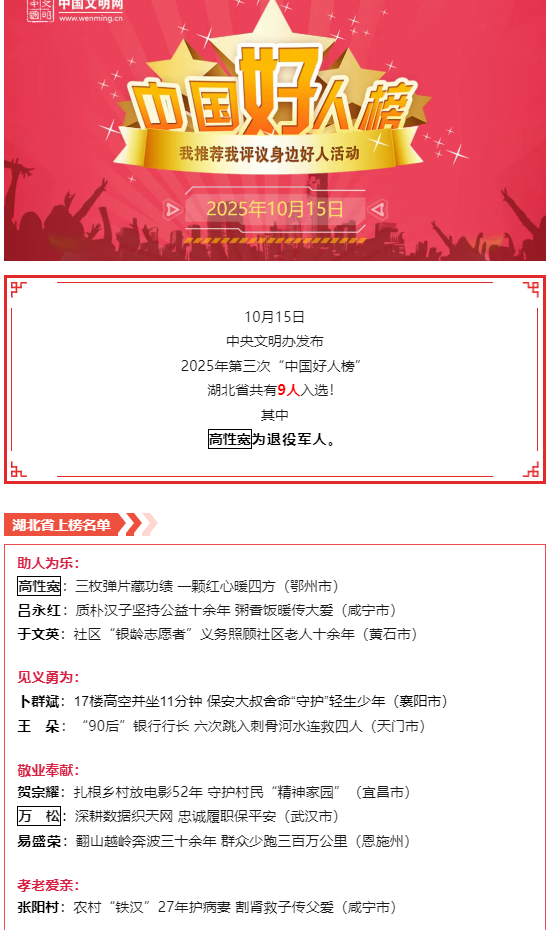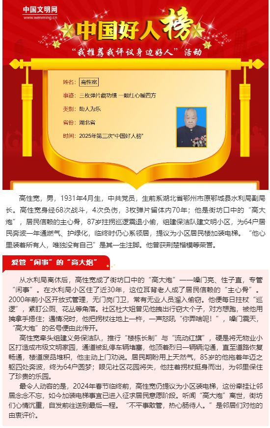 三枚弹片藏功绩!高性宽入选2025年第三次“中国好人榜”