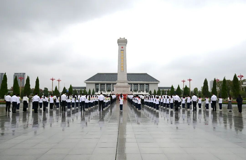 苍松绿柏,丰碑矗立,鄂州市烈士纪念园一派庄严肃穆。雨丝如织,轻抚着巍峨的烈士纪念碑;青松似笔,默默记录着不朽功勋。市领导和社会各界代表身着素装,手持黄菊,面向纪念碑列队肃立。
